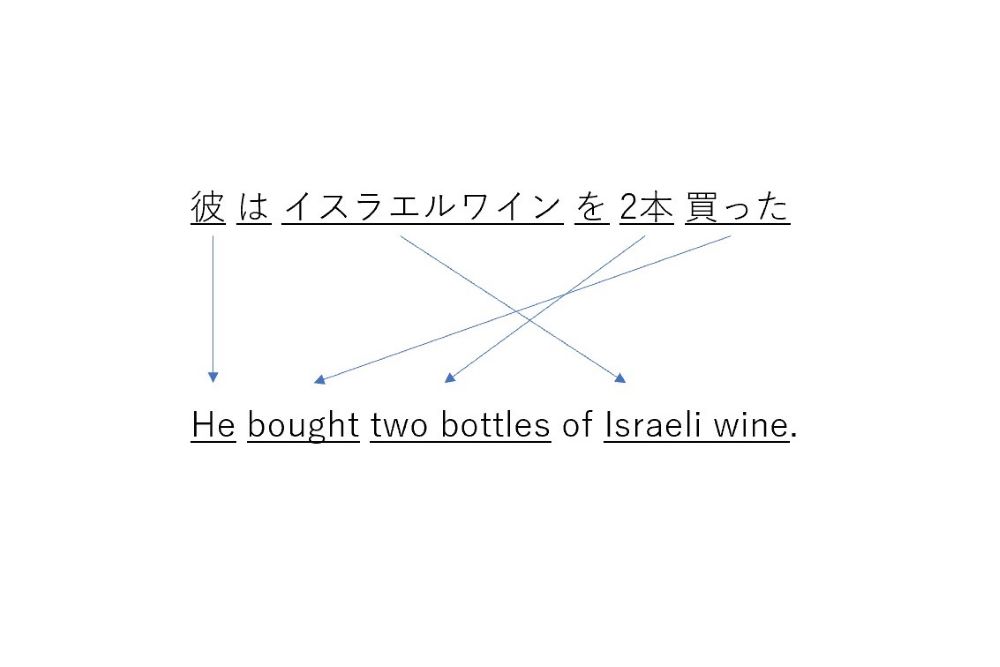 もともとOpen AIは非営利の研究機関として5年前にスタートし、GPT(Generative Pretrained Transformer)と呼ばれる言語モデルを開発してきた。従来のAIは大量のデータを学習することにより、例えば顔やレントゲン画像の“認識・解析”などで使われてきたが、このGPTではAI自体が“何かを作り出す”という特徴から生成AI(Generative AI)と呼ばれる。大元はGoogleの翻訳研究から生まれたTransformerというモデルである。機械学習の自然言語処理モデルを発展させたもので、大規模なテキストデータを学習し文章中のキーワードの関係を推論してゆく。例えば、「彼はイスラエルワインを2本買った」という日本語を「He bought two bottles of Israeli wine.」という英文に翻訳するには、図のような日本語・英語間での単語の関連付けや順序の並べ替えを行われることが想像できるだろう。