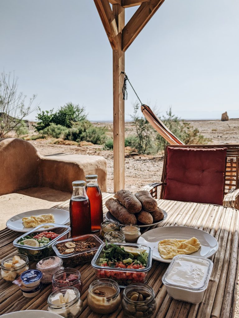 希望者には、事前予約で朝ごはんが用意されます。ディップ、スプレッド、パン、チーズ、ミューズリー、ジュース、卵が入ったクーラーボックスが朝8時に届けられ、卵は自分たちでキッチンで調理します。砂漠の絶景を見ながらの料理は、他ではなかなか体験できないですよ。